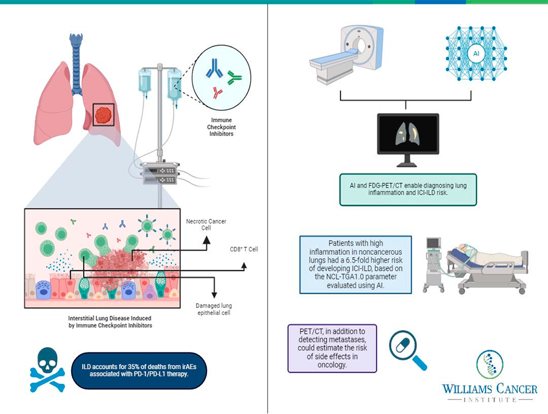 Fluorodeoxyglucose positron emission tomography/computed tomography (FDG-PET/CT) is the standard method for routine staging before lung cancer treatment. Since FDG accumulates not only in cancerous tissues but also in inflamed areas, recent studies have demonstrated its usefulness in diagnosing and managing pulmonary inflammation. Based on this, the researchers hypothesized that FDG-PET/CT could assess pre-existing lung inflammation and predict the development of ICI-ILD, considering that this complication arises when inflammatory cells activated by immunotherapy attack not only cancer cells but also healthy tissues.