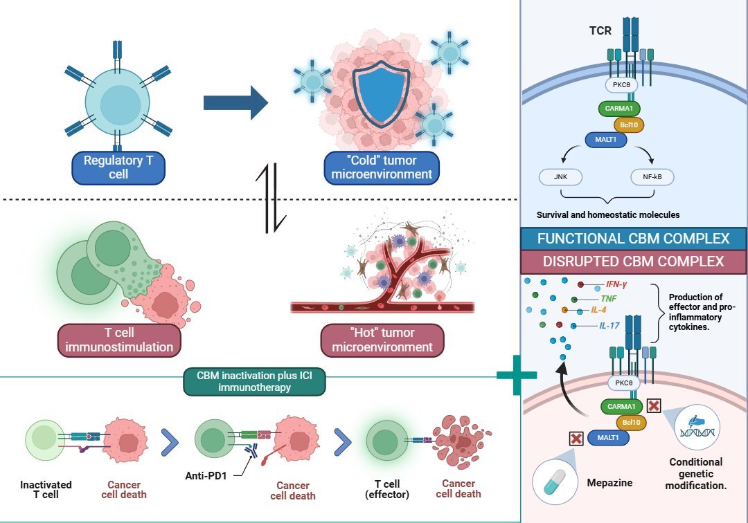 Figure 1.  Inactivation of the CBM complex in Treg cells reprograms the tumor microenvironment from “cold” to “hot,” promoting the production of pro-inflammatory cytokines and enhancing anti-PD-1 immunotherapy. Disruption of the complex through mepazine or genetic modification enables effector T cell reactivation and tumor cell elimination.
