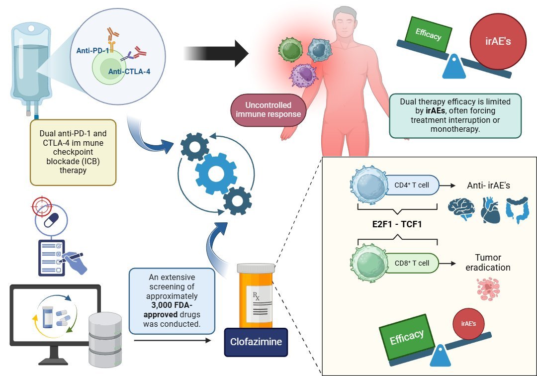 Figure 1. A high-throughput screening of ~3,000 FDA-approved drugs identified clofazimine as a potent adjuvant to dual anti-PD-1 and anti-CTLA-4 therapy. Clofazimine promotes CD8⁺ T cell-mediated tumor eradication and modulates CD4⁺ T cell responses via the E2F1-TCF1 pathway, reducing irAEs without compromising efficacy.