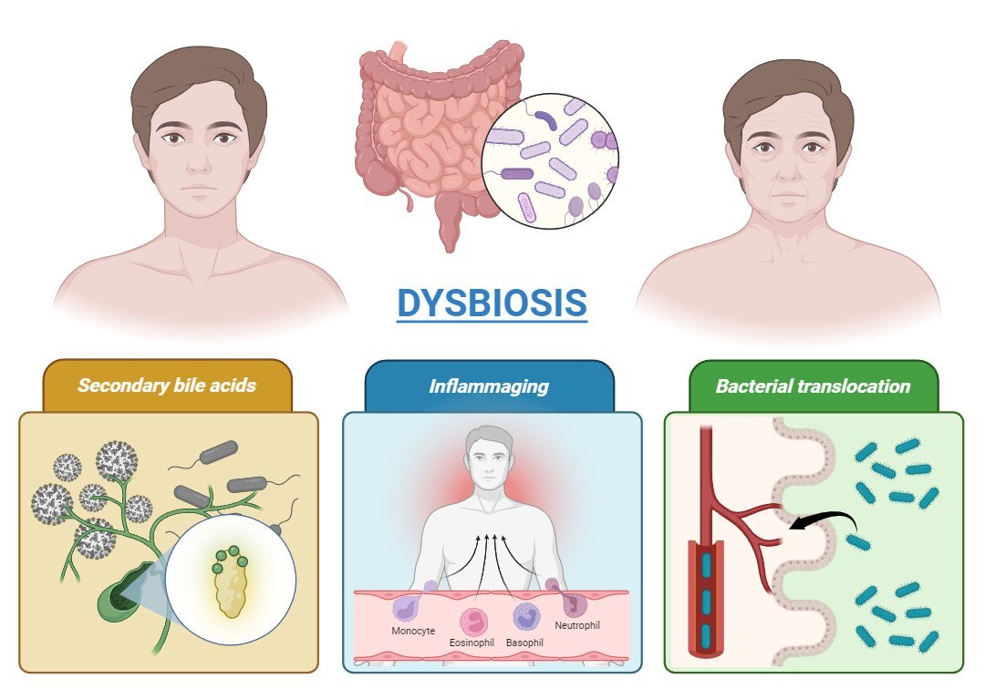 Figure 1. Impact of dysbiosis on aging: The alteration of the gut microbiome is associated with key processes such as the reduction of beneficial secondary bile acids, the increase in chronic inflammation (inflammaging), and bacterial translocation, contributing to the progression of age-related diseases.