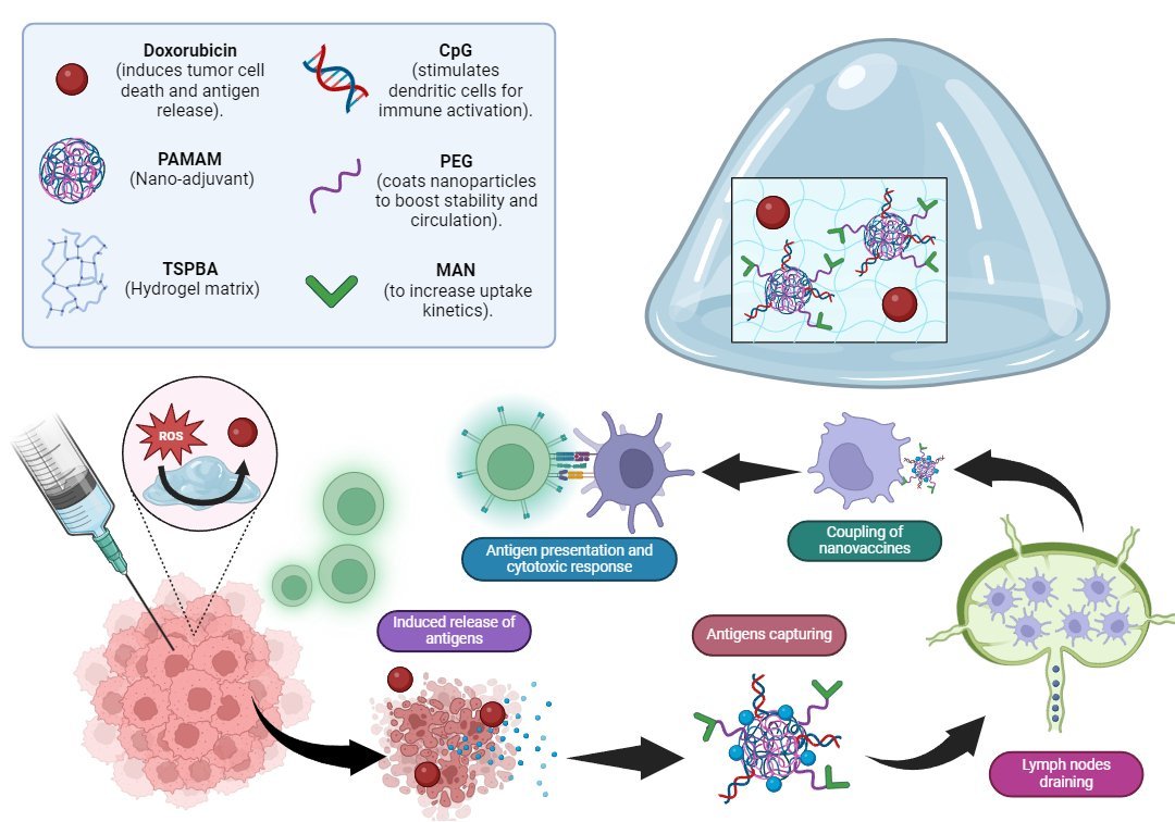 The concept of an in situ vaccine involves converting the primary tumor into its own source of antigens, stimulating a specific immune response against cancer. In this study, researchers designed a system based on nanoparticles and a reactive oxygen species (ROS)-sensitive hydrogel to administer the vaccine directly into the tumor microenvironment. This strategy enables controlled drug release and efficient stimulation of dendritic cells, which are essential for immune activation.
