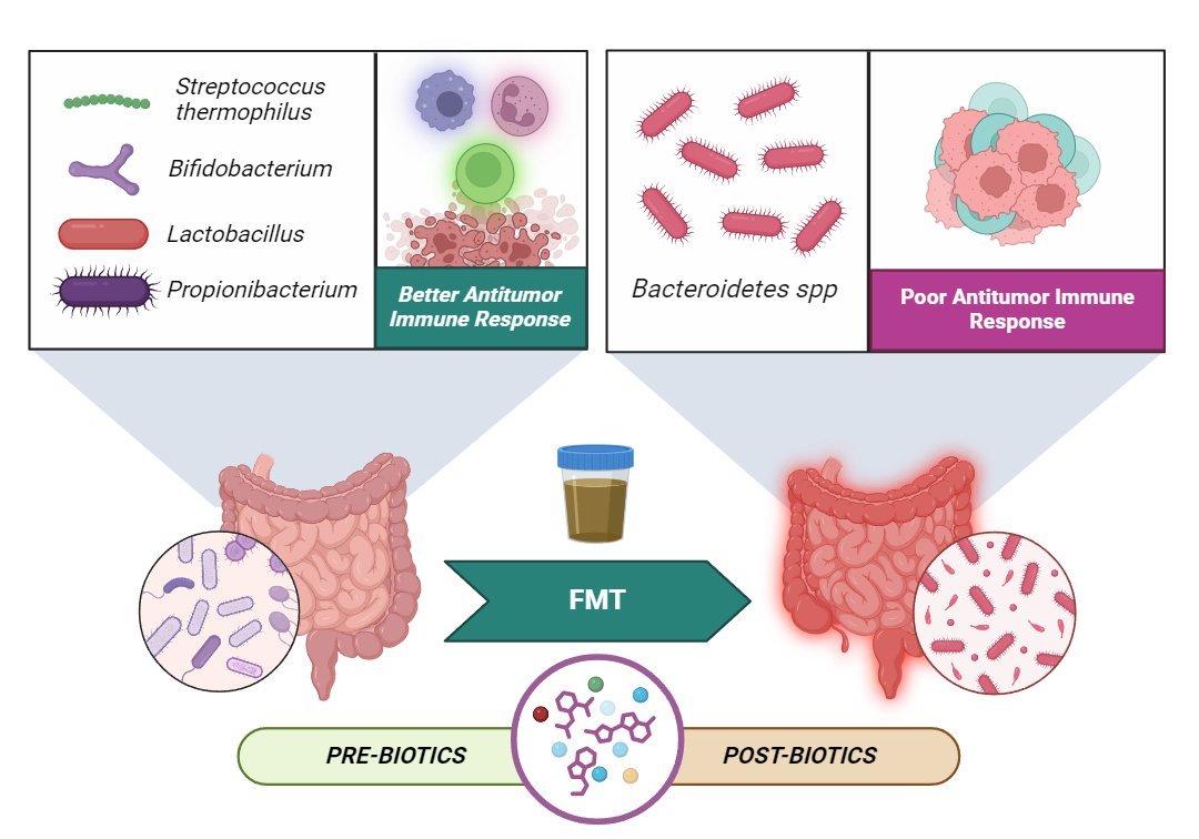 Figure 1. The impact of the gut microbiome on antitumor immune responses, contrasting beneficial and detrimental microbial influences. It highlights how therapies like fecal microbiota transplantation (FMT), prebiotics, and postbiotics can modulate the microbiome to improve immune function and enhance cancer treatment outcomes.
