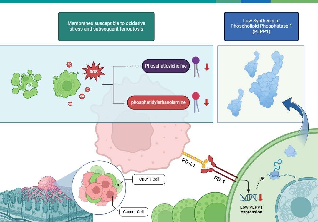 Figure 1. Influence of PD-1/PD-L1 interaction on the inhibition of Phospholipid Phosphatase 1 (PLPP1) expression in CD8+ T cells. Reducing PLPP1 levels consequently reduces the presence of Phosphatidylcholine and phosphatidylethanolamine in cell membranes, causing increased susceptibility to oxidative stress damage and subsequent ferroptosis.