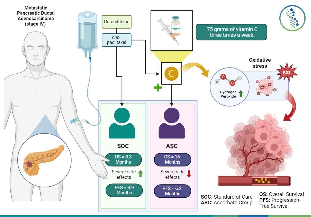 Metastatic pancreatic cancer is one of the most aggressive and difficult-to-treat forms of cancer, with an average survival of less than a year. However, recent studies have explored new strategies to improve outcomes, including the use of high-dose vitamin C (administered intravenously at very high concentrations) as part of the treatment.